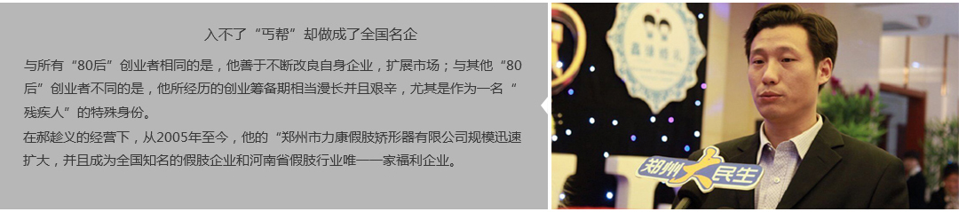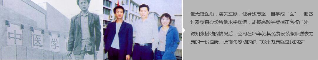 鄭州市力康假肢矯形器有限公司(簡稱力康),是一家專業從事假肢矯形器的設計、研發、制作及裝 配的專業機構。成立于1992年是河南省唯一一家福利企業。力康下設業務部、技術部、住院部、康復 部、售后服務部,并配有現代化的裝配車間和功能齊全的訓練大廳,為殘疾朋友康復訓練提供了可靠 保障??偨浝泶┐骷僦嗄?,有著豐富的臨床經驗和親身體會;多年來,力康已為全國幾十萬名殘疾 朋友安裝上舒適、美觀、耐用的假肢和矯形器具,使他們更大限度地恢復了正常的工作和生活。“產 品即人品”的質量理念、先進的技術、實惠的價格、完善的售后服務是力康取勝的法寶……